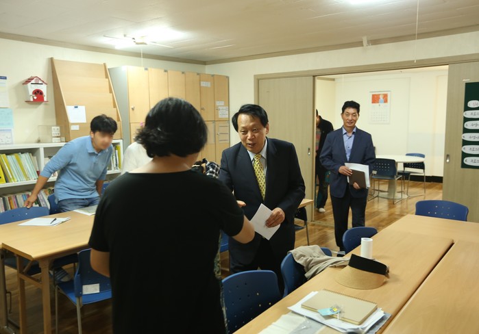 이성 서울 구로구청장이 9일 추석을 맞아 구청 간부들과 57개 복지시설을 돌며 위문금을 전달하고 애로사항을 청취했다. 사진은 이 구청장이 위문금을 전달하고 있는 모습.(사진제공=구로구청)