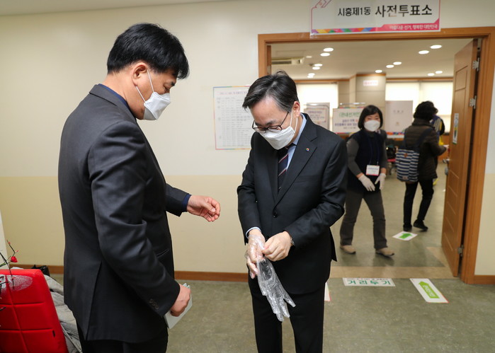 유성훈 서울 금천구청장이 서울시장 보궐선거 사전투표 첫째 날인 2일 시흥1동 주민센터에 마련된 사전투표소에서 투표했다. 사진은 유 구청장(오른쪽)이 투표하기 전 비닐장갑을 끼고 있는 모습. (사진제공=금천구청)