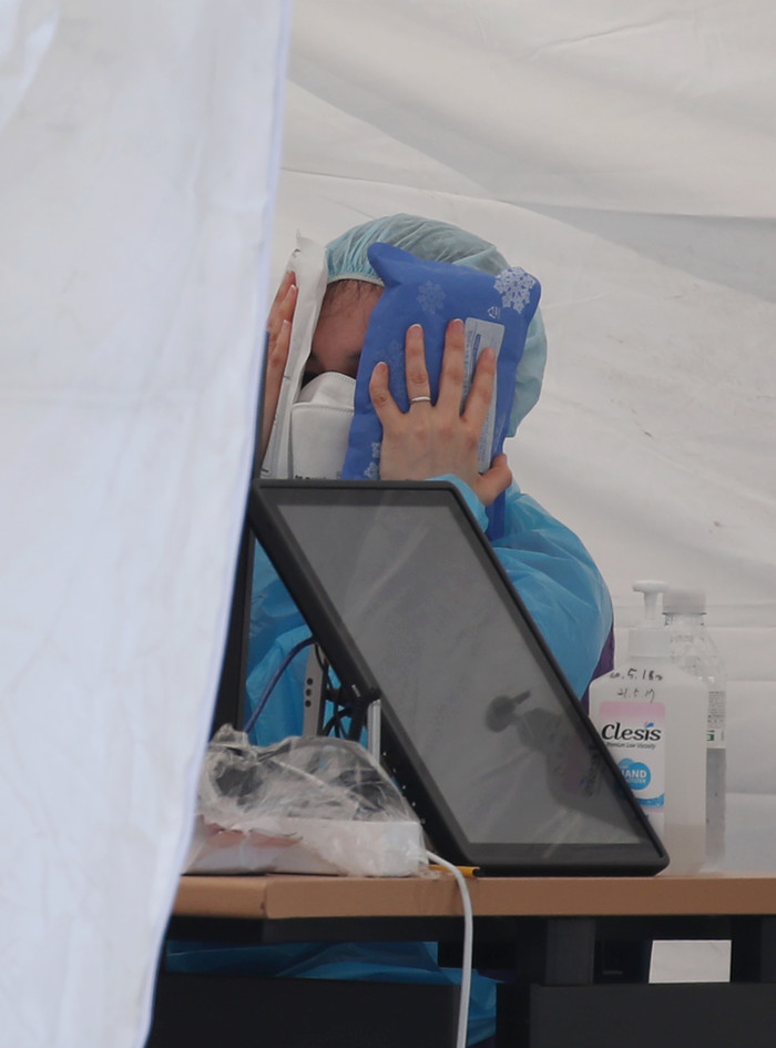 지난 8일 서울 중랑구 서울의료원 코로나19 선별진료소에서 의료진이 얼음팩으로 얼굴을 감싸며 더위를 식히고 있다.