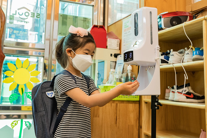 | ▲ 광진구 내 한 어린이집에서 아동이 손소독 발열체크기를 사용하고 있는 모습 (사진제공=광진구청) |