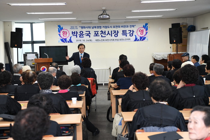 박윤국 경기 포천시장이 최근 포천동다목적복지관에서 (사)대한노인회 포천시지회 부설 포천노인대학 90여명을 대상으로 '평화시대 남북경협 거점도시 포천의 비전과 전략'이라는 주제로 특강을 했다. 사진은 박 시장이 강의를 진행하는 모습. (사진제공=포천시청)