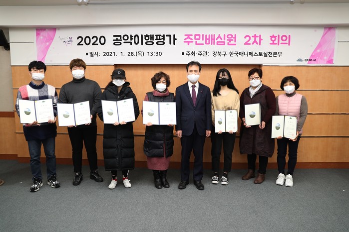 최근 강북구가 만 19세 이상 구민 40여명을 공약이행 현황을 직접 확인하고 실천계획의 이행가능성 등을 평가해 주민 스스로 대안을 제안하는 공약이행평가 주민배심원으로 위촉했다. 사진은 위촉식에서 박겸수 구청장(오른쪽에서 네 번째)이 주민배심원에게 위촉장을 전달한 후 기념촬영한 모습. (사진제공=강북구청)