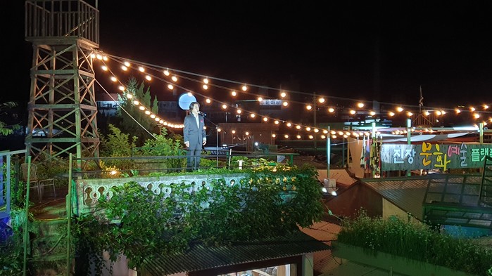 | 이종훈 밀양오페라단 단장이 미리미동국 지붕위에서 공연하는 모습 |