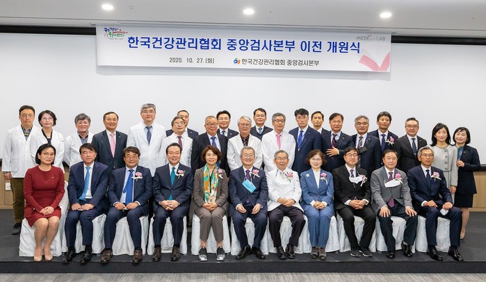 노현송 강서구청장이 지난 27일 열린 한국건강관리협회 중앙검사본부 확장 이전 개원식에 참석했다. 건협 중앙검사본부는 우리나라 유일한 건강검진 전문 수탁 검사기관으로 최근 5년 동안 진단검사 건수가 매년 증가함에 따라 우수한 검사시설과 첨단 의료장비를 갖춰 구로 확장 이전했다. 사진은 이날 개원식에 참석한 노 구청장(앞줄 왼쪽 네 번째) 및 관계자들이 기념촬영을 하는 모습. (사진제공=강서구청)