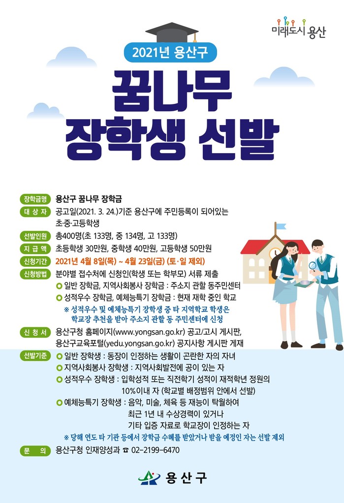[시민일보 = 홍덕표 기자] 서울 용산구(구청장 성장현)가 교육 기회균등, 미래인재 육성을 위해 8일부터 오는 23일까지 '2021년 꿈나무 장학생'을 모집한다.