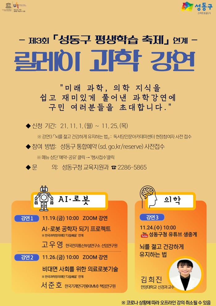 [시민일보 = 홍덕표 기자] 서울 성동구(구청장 정원오)는 이달 19~26일 ‘구민과 소통하는 '3인 3색 릴레이 과학 강연'을 진행한다.