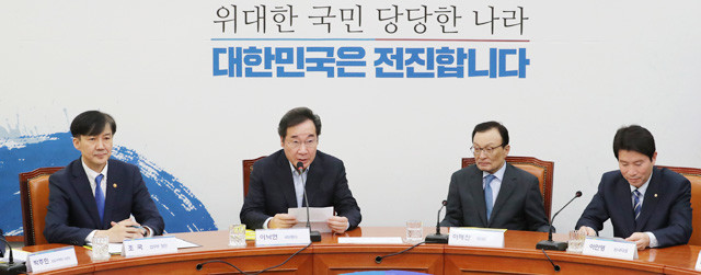 국무총리가 13 오후 국회 더불어민주당 대표실에서 열린 검찰개혁 고위 당정협의회에서 발언하고 있다. 왼쪽부터 조국 법무부 장관, 이낙연 국무총리, 이해찬 대표, 이인영 원내대표.