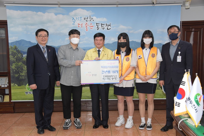 경기 동두천시 한국문화영상고등학교 레오클럽 봉사단이 최근 동두천시청을 방문해 코로나19 확산 방지에 최선을 다하는 공무원을 위해 직접 제작한 간식키트 150개와 감사의 메시지를 전달했다. 사진은 최용덕 시장(왼쪽에서 세 번째)과 학생들의 기념촬영 모습. (사진제공=동두천시청)