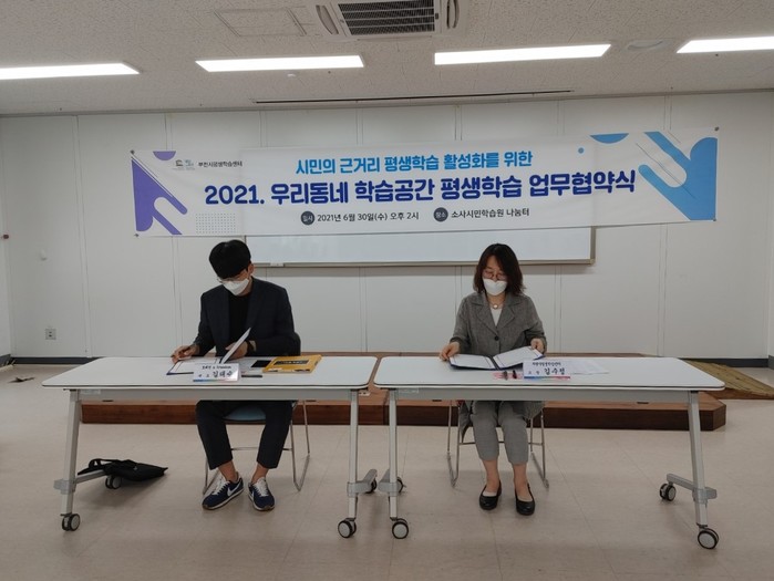 경기 부천시평생학습센터는 최근 ‘소사하루’ 등 21곳과 ‘우리동네 학습공간’ 업무협약을 체결했다. 우리동네 학습공간은 카페·공방 등 지역내 유휴공간을 학습공간으로 지정해 시민이 근거리에서 학습할 수 있도록 평생학습 강좌를 제공하고 학습모임 장소를 공유하는 사업이다. 사진은 협약식에서 관계자들이 서명을 하는 모습. (사진제공=부천시청)