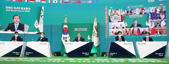 문재인 대통령이 21일 오후 청와대에서 주요 20개국(G20) 정상회의에 참석, 발언하고 있다.