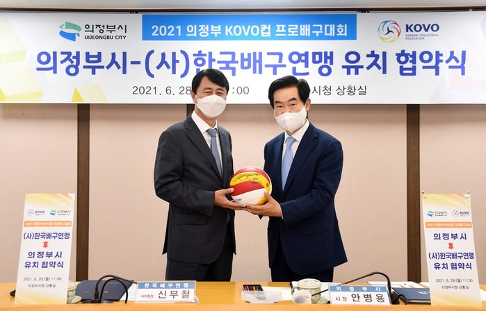경기 의정부시는 28일 2021 의정부 KOVO컵 프로배구대회 유치협약을 체결했다. 의정부 KOVO컵은 배구 단일대회 최대 규모 프로대회로 남녀부 총 14팀이 참가하며 의정부체육관에서 오는 8월14~29일 진행된다. 사진은 협약식에서 안병용 시장(오른쪽)과 신무철 (사)한국배구연맹 사무총장이 기념촬영을 하는 모습. (사진제공=의정부시청)