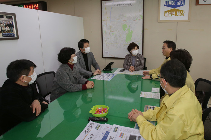7일 김동희 경기 부천시의회 의장이 신종 코로나 바이러스 감염증 확산 방지를 위해 비상근무체제를 유지하고 있는 부천시 재난안전대책본부를 방문해 직원들을 격려했다. 사진은 부천시의 대응상황 등을 보고 받고있는 김동혁 의장(가운데)과 관계자들의 모습. (사진제공=부천시의회)