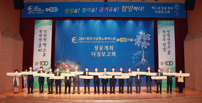 함양산삼항노화엑스포조직위(위원장 김경수 경상남도지사)는 27일 오전 함양군 문화예술회관 대공연장에서 서춘수 함양군수를 비롯하여 유관기관·단체장, 함양군민 등 200여명이 참석한 가운데 함양산삼항노화엑스포 성공개최 다짐를 위한 D-100일 기념 추진상황 보고회를 개최했다고 밝혔다.