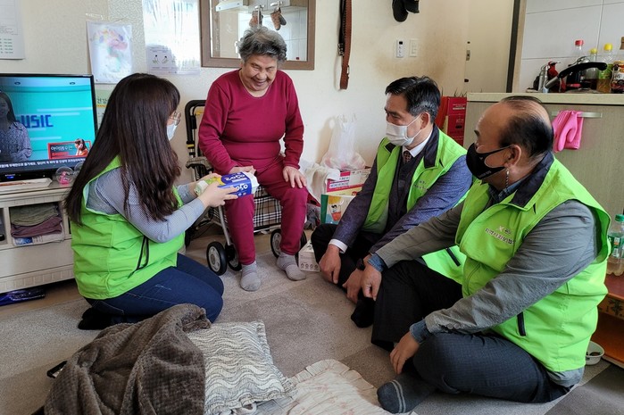 경기 광주시 광남1동 지역사회보장협의체는 ‘에그-WiFi 틈새 없는 복지구축망’ 사업을 추진해 홀몸노인 등 돌봄 대상자에게 지역농산물인 자연채 계란을 월 2회 전달하며 안부를 확인한다. 사진은 최근 홀몸노인을 방문해 계란을 전달하고 대화를 하고 있는 모습. (사진제공=광주시청)