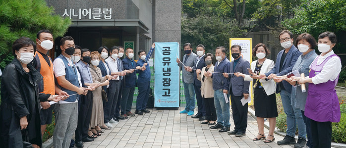 경기 광주시 지속가능발전협의회가 지난 28일 쌍령동 푸르지오 아파트에서 '공유냉장고' 3호점 개소식을 했다. 3호점은 아파트 단지내 최초 입점으로 입주민 및 택배 등 노동자들이 쉽게 접근할 수 있어 지원받은 생수를 제공할 예정이다. 사진은 개소식에서 신동헌 시장(가운데 왼쪽)과 관계자들이 제막식을 하는 모습. (사진제공=광주시청)