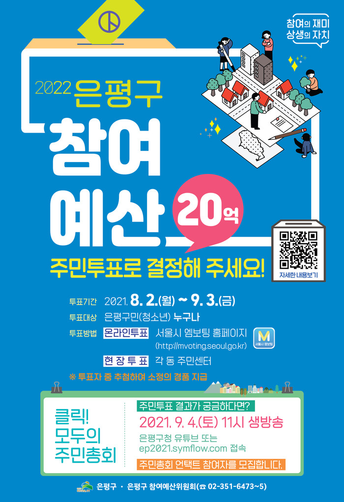 [시민일보 = 이대우 기자] 은평구(구청장 김미경)는 2022년 참여예산사업(과제) 선정을 위한 주민투표·청소년투표를 오는 9월3일까지 서울시 엠보팅 홈페이지에서 진행한다.