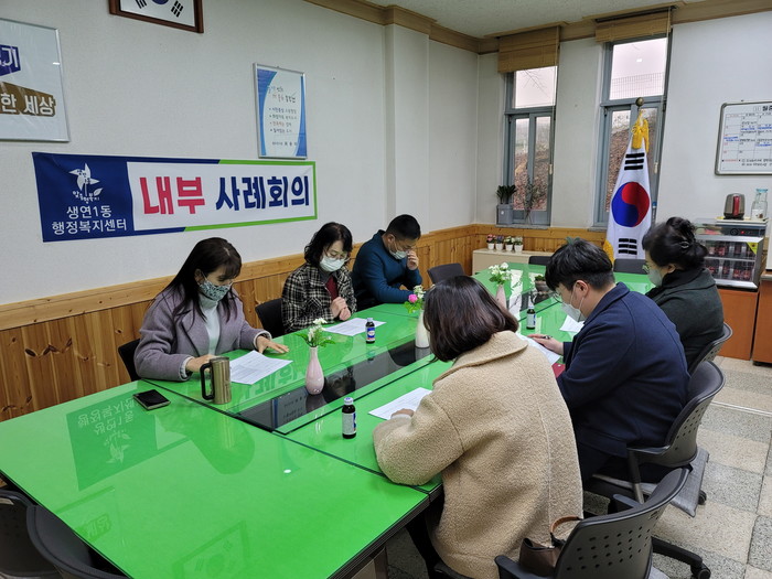 경기 동두천시 생연1동 행정복지센터가 27일 다양한 위기사유로 어려움을 겪고 있는 5가구의 복지서비스 연계·지원 및 점검을 위한 내부사례회의를 진행했다. 이날 회의에서는 보호자 없이 홀로 살고 있는 가구 중 알코올중독과 당뇨 등의 질병을 제때에 치료하지 않아 질병이 악화된 가구와 뇌병변장애가 있는 고령의 노부부의 거주환경 개선 및 돌봄, 질병치료 등의 문제 해결을 위한 논의를 진행했다. 사진은 참여자들이 회의하고 있는 모습. (사진제공=동두천시청)