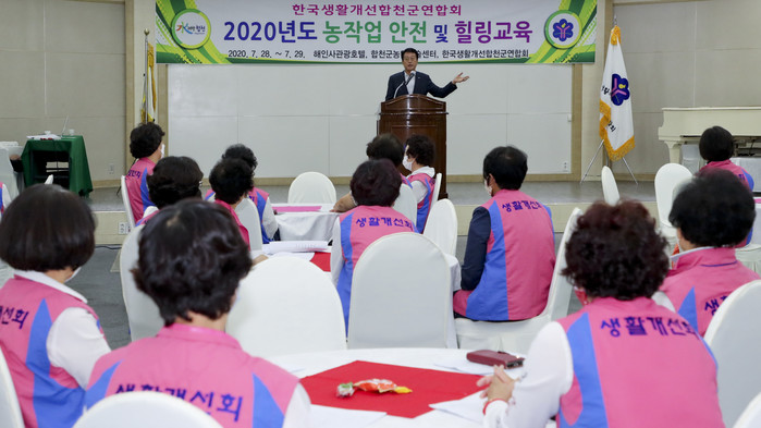 합천군(군수 문준희)과 한국생활개선합천군연합회(회장 김남숙)에서는 2020. 7.28.(화) 15:00 해인사관광호텔에서 문준희 합천군수, 배몽희 합천군의회 의장, 김윤철 경상남도의원, 정순재 가야면장, 박준식 농업유통과장 및 회원 80명이 참석한 가운데 2020년 농작업 안전 및 힐링 교육 개회식을 가졌다.