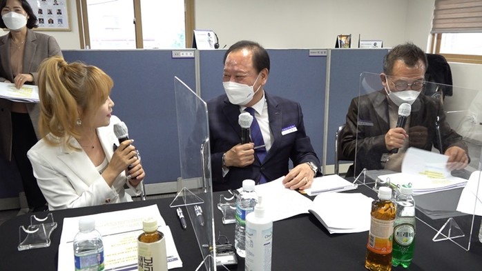 유동균 서울 마포구청장이 최근 제14회 마포나루 새우젓축제의 일환으로 진행된 마포 행복주파수 망원시장편에 참여해 코로나19로 지친 상인들에게 응원의 메시지를 전달하고, 시장 상인의 사연 소개 및 신청곡 송출을 진행했다. 사진은 유 구청장(가운데)이 마포 행복주파수에 출연해 방송을 진행하는 모습. (사진제공=마포구청)