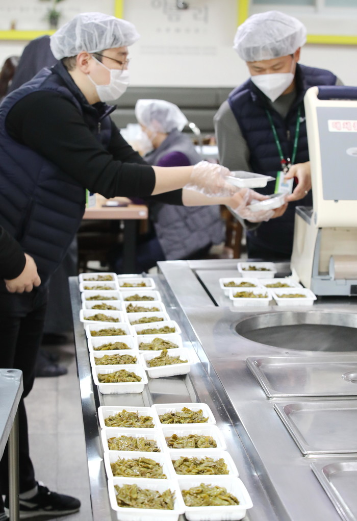 9일 서울 성동종합사회복지관에서 직원들이 반찬을 포장하고 있다. 복지관은 코로나19 확산 방지를 위해 무료 급식소를 폐쇄하고 일곱끼 분량의 도시락 및 대체식을 지역내 취약계층에 일주일에 한번 배달하고 있다.