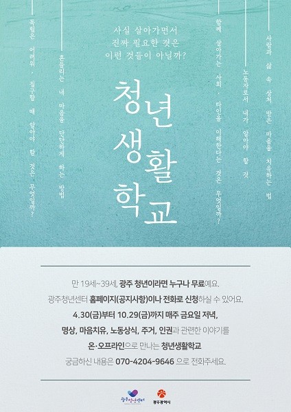 청년생활학교는 광주청년센터 홈페이지를 통해서 신청할 수 있으며, 자세한 사항은 전화로 문의 가능하다.