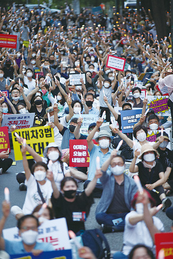 지난 25일 오후 서울 중구 예금보험공사 앞에서 열린 ‘소급적용 남발하는 부동산 규제 정책 반대, 전국민 조세 저항운동 촛불집회’참가자들이 촛불을 들고 있다.