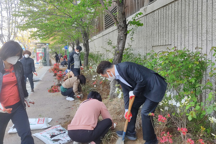인천 동구 송림3·5동은 20일 봄을 맞아 지역내 동산휴먼시아 2단지 아파트 담장 옆 빈 자투리 땅에 꽃밭을 조성했다. 사진은 이날 허인환 구청장(오른쪽)이 주민들과 함께 꽃을 심고 있는 모습. (사진제공=동구청)