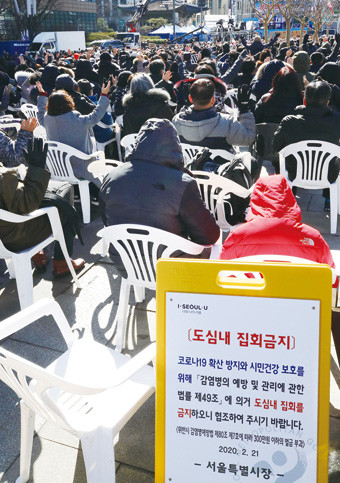 서울시가 코로나19 확산 방지를 위해 광화문광장, 서울광장, 청계광장에서 집회를 여는 것을 금지한 지 사흘째인 23일 오전 서울 광화문광장 인근 도로에서 열린 문재인하야범국민투쟁본부(범투본) 주최 집회에 많은 시민들이 참석하고 있다.