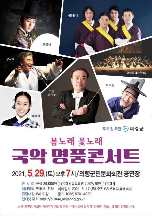 의령군(군수 오태완)은 5월 가정의 달을 맞이하여 오는 5월 29일(토) 저녁 7시 의령군민문화회관 공연장에서 군민들에게 문화와 예술의 향기를 전하기 위해 ‘봄노래 꽃노래 국악 명품콘서트’를 무대에 올린다.
