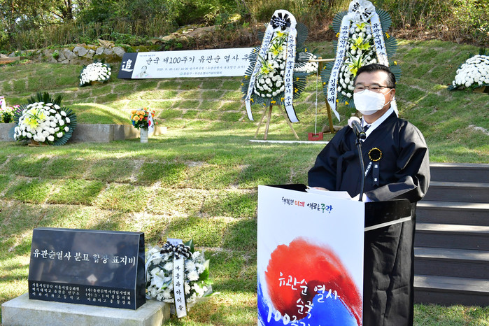 중랑구가 지난 26일 오후 2시 유관순 열사 순국 100주기를 맞아 ‘망우리공원 유관순 열사 분묘 합장 묘역’에서 유관순열사기념사업회와 공동으로 추모식을 진행했다. 사진은 추모식에 참석한 류경기 구청장이 추념사를 낭독하고 있는 모습. (사진제공=중랑구청)