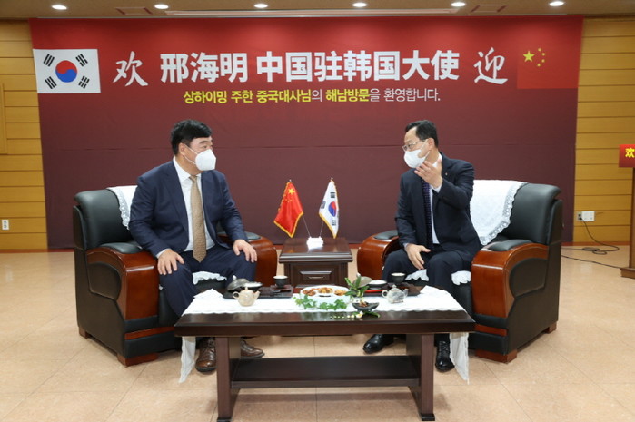 [해남=정찬남 기자] 명현관 전남 해남군수와 싱하이밍(邢海明) 주한중국대사가 올 들어 두 번째 만남을 가졌다.