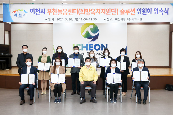 경기 이천시는 30일 무한돌봄센터(희망복지지원단) 솔루션위원 신규 위촉식을 열고 노인·장애인 등 다양한 분야의 전문가 13명과 당연직 위원 2명에게 위촉장을 전달했다. 사진은 위촉식에서 엄태준 시장(앞줄 가운데)과 위원들이 기념촬영을 하는 모습. (사진제공=이천시청)