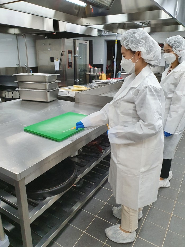경기 부천시는 최근 현장대응 역량 강화를 위한 식중독 대비 모의훈련을 했다. 훈련은 집단급식소에서 점심을 취식한 280명 중 20명의 식중독 의심환자가 발생한 상황을 가정해 진행됐다. 사진은 검체 채취 시연을 하고 있는 모습. (사진제공=부천시청)