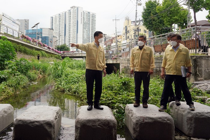 서울 성북구가 본격적인 장마를 앞두고 풍수해 취약시설에 대한 집중 점검을 진행하고 있다. 사진은 8일 성북천 점검에 나선 이승로 구청장이 구 간부들과 함께 폭우시 성북천의 안전시설에 대해 이야기를 나누고 있는 모습. (사진제공=성북구청)