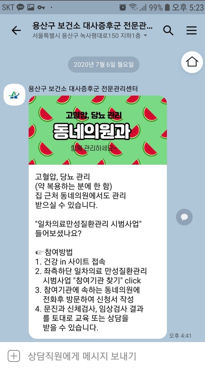 | ▲ 대사증후군센터 카카오톡 채널 캡쳐 화면. (사진제공=용산구청) |