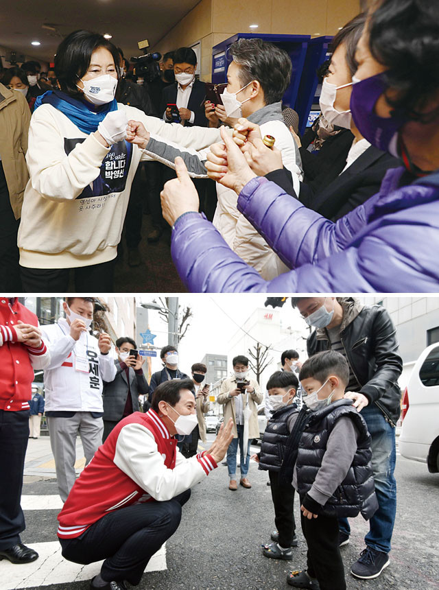 더불어민주당 박영선 서울시장 후보가 28 서울 서초구 고속버스터미널 경부선 광장에서 집중 유세를 마친 지하상가를 찾아 인사하고 있다. 국민의힘 오세훈 서울시장 후보도 28 오후 서울 강남구 압구정로 가로수길을 찾아 시민들과 인사하고 있다.