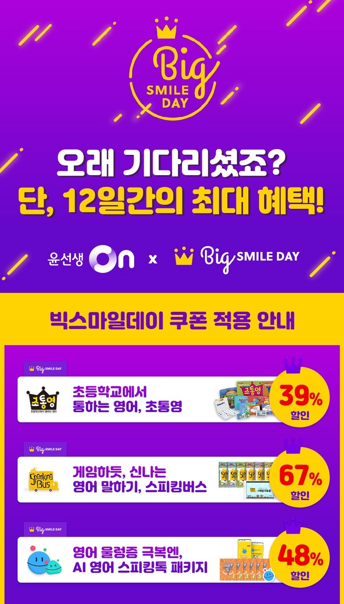 [시민일보 = 여영준 기자] 영어교육 전문기업 윤선생은 빅스마일데이 기간 G마켓·옥션에서 자사 엄마표 영어·온라인 학습 상품 ‘윤선생 초통영’과 ‘윤선생 스피킹버스’, ‘윤선생 스피킹톡’을 할인 판매한다고 3일 밝혔다.