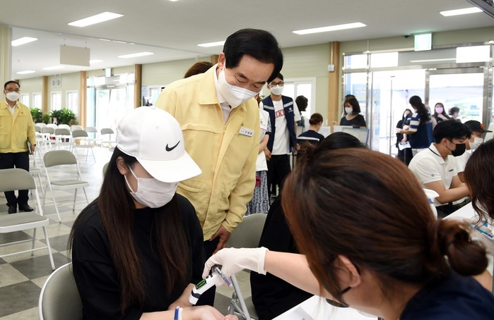 안병용 경기 의정부시장은 20일 코로나19 예방접종센터를 방문해 화이자 예방접종 대상인 고3 수험생들과 교직원들의 예방접종이 원활히 진행되고 있는지 상황을 점검했다. 사진은 안 시장이 백신접종 수험생들의 체온 확인을 지켜보고 있는 모습. (사진제공=의정부시청)