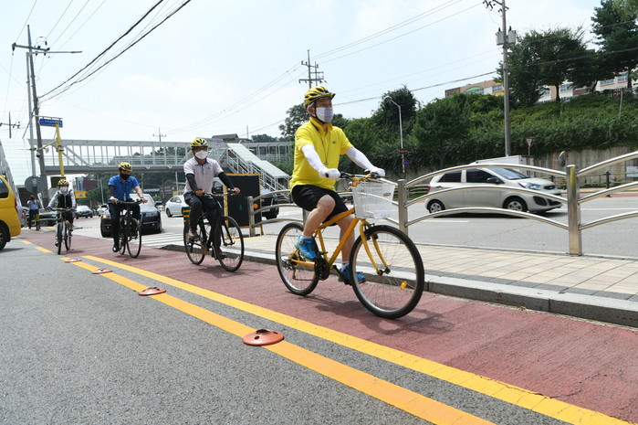 안승남 경기 구리시장이 19일 생활자전거 활성화를 위해 방치자전거를 활용한 재생자전거를 타고 관계 공무원 등과 함께 경춘로 외 5곳의 자전거도로를 둘러보며 상권 활성화 지역과 자전거도로의 연계성, 도로 확충 사업 대상지 등을 점검했다. 사진은 안 시장이 자전거를 타고 도로를 둘러보는 모습. (사진제공=구리시청)
