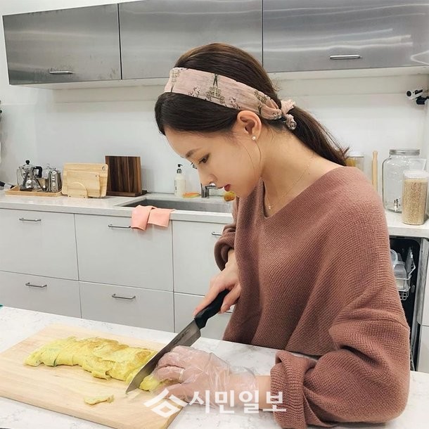 공개된 사진 속 그는 계란말이를 썰며 청순한 미모를 자랑해 시선을 사로잡았다.