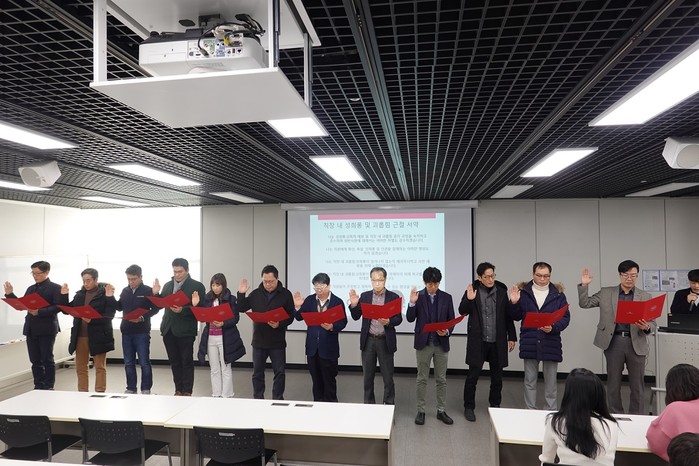 선서에는 직원의 인권 보호와 건전하게 근무할 수 있는 조직문화를 조성하고, 직장 내 성희롱·괴롭힘 관련 규정 숙지, 사전 예방과 감시를 위한 노력, 피해복구 지원 등을 담고 있다.