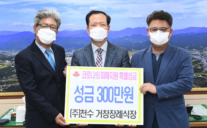 이어서 22일에는 ㈜천수 거창장례식장(대표 김수원)에서 성금 300만 원을 기탁했다. 장팔리에서 장례식장을 운영하는 김수원 대표는 “코로나19로 인해 어려움을 겪고 있는 분들에게 조금이나마 도움이 되고자 기부에 동참하게 됐다”고 밝혔다.