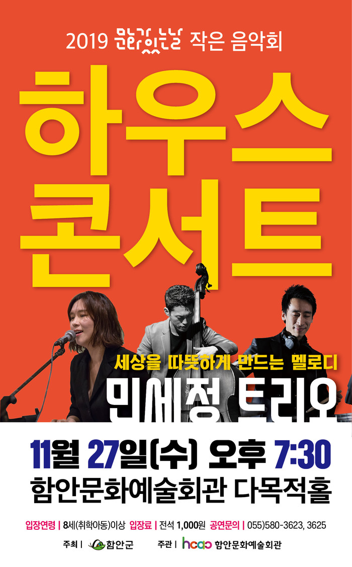 11월 하우스콘서트 ‘민세정 트리오’ 공연이 오는 27일 수요일 오후 7시 30분 함안문화예술회관 다목적홀에서 개최된다.