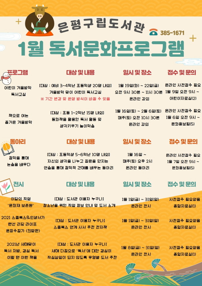 이달 진행되는 프로그램을 살펴보면, ▲ 어린이 겨울방학 독서교실 ▲ 책으로 여는 즐거운 겨울방학 ▲ 철학을 통해 논술을 배우다 ▲이달의 직업 ‘문화재 보존원’ ▲2021 스쿨북스&인생서가 랜선 리딩 라이프 문장수집가<희망편> ▲2021년 새해맞이 독서 처방, 결심 독서 이럴 땐 이런 책을 등이 진행된다.