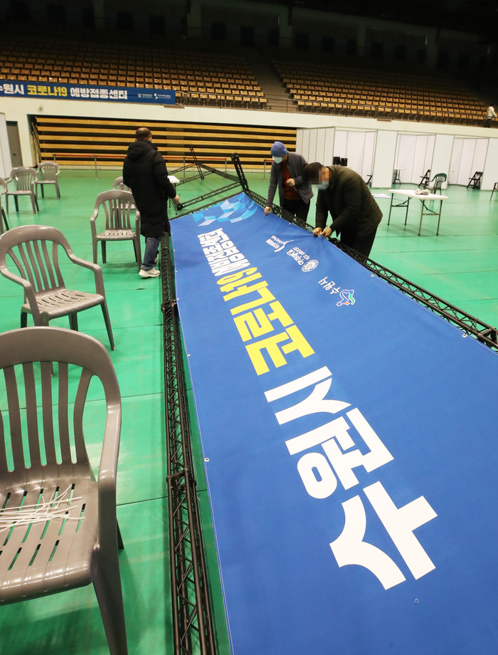 22일 오전 경기 수원시 아주대학교 체육관에서 관계자들이 수원시 코로나19 예방접종센터 설치작업을 하고 있다.