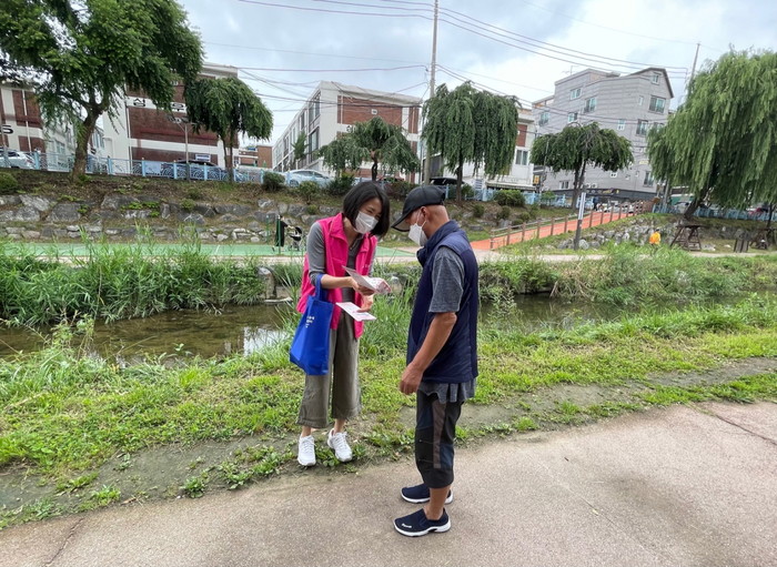 경기 수원시 권선구 세류3동 지역사회보장협의체는 지난 5~7일을 복지사각지대 집중 발굴 기간으로 정하고, 수원천 생활체육시설 일대, 세류3동 행정복지센터 등에서 긴급지원 및 국민기초생활보장 대상자 요건 완화를 널리 알리기 위한 ‘함께 찾기’ 캠페인을 펼쳤다. 사진은 주민들에게 캠페인 홍보물을 나눠주고 있는 모습. (사진제공=권선구청)