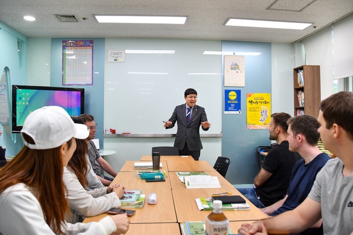 ▲ 외국인 수강생들이 이관수 의장의 한국어 수업을 경청하고 있다. (사진제공=강남구의회) |