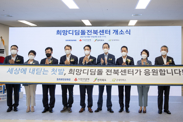 이날 열린 '삼성 희망디딤돌' 전북센터 개소식에는 송하진 전라북도지사, 김성주 더불어민주당 국회의원, 김상균 사회복지공동모금회 사무총장, 이호균 굿네이버스 이사장, 윤혜미 아동권리보장원 원장, 최윤호 삼성전자 경영지원실 사장 등이 참석했다.