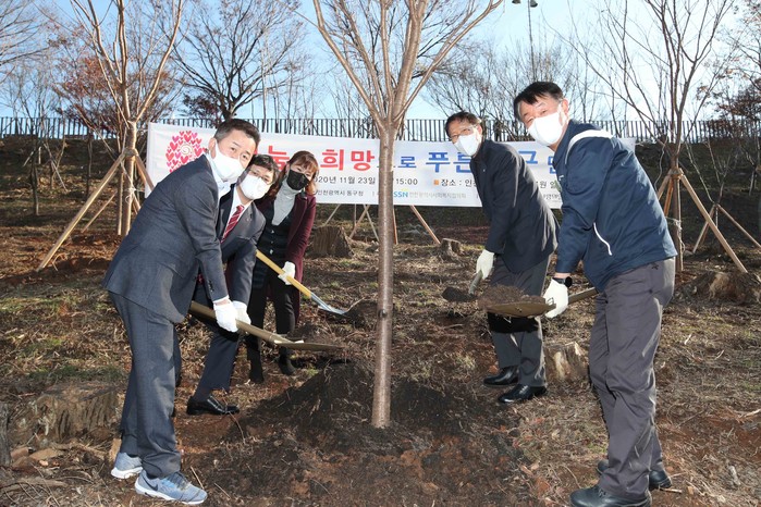 인천 동구는 23일 ‘나눔과 희망으로 푸른 동구 만들기’ 나무심기 행사를 열고 송현근린공원 절개지에 토사유출 방지를 위한 벚나무 52주를 심었다. 사진은 이날 허인환 구청장(왼쪽)이 나무심기 협약기관 관계자, 김주희 자연보호동구협의회장 등 내빈들과 나무를 심고 있는 모습. (사진제공=동구청)