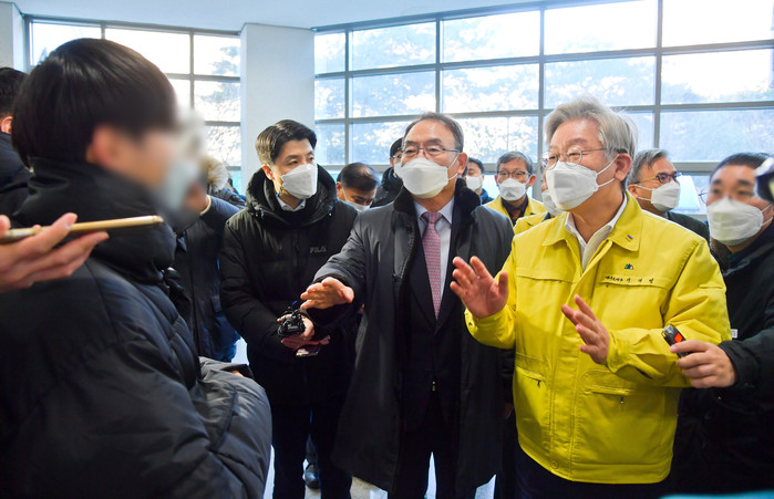 이재명 경기도지사가 14일 오전 코로나19 확산에 따른 긴급동원조치로 생활치료센터로 전환 예정인 경기 수원시 경기대학교 경기드림타워를 방문해 학생들과 이야기를 나누고 있다.
